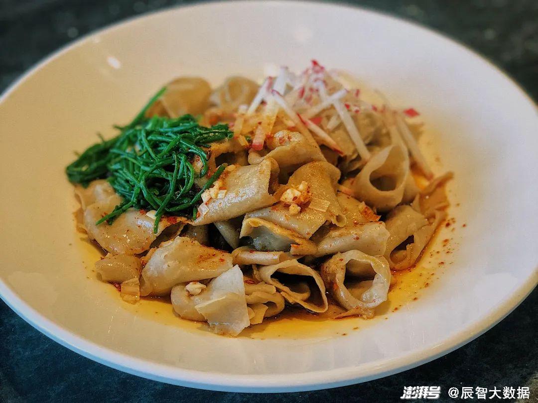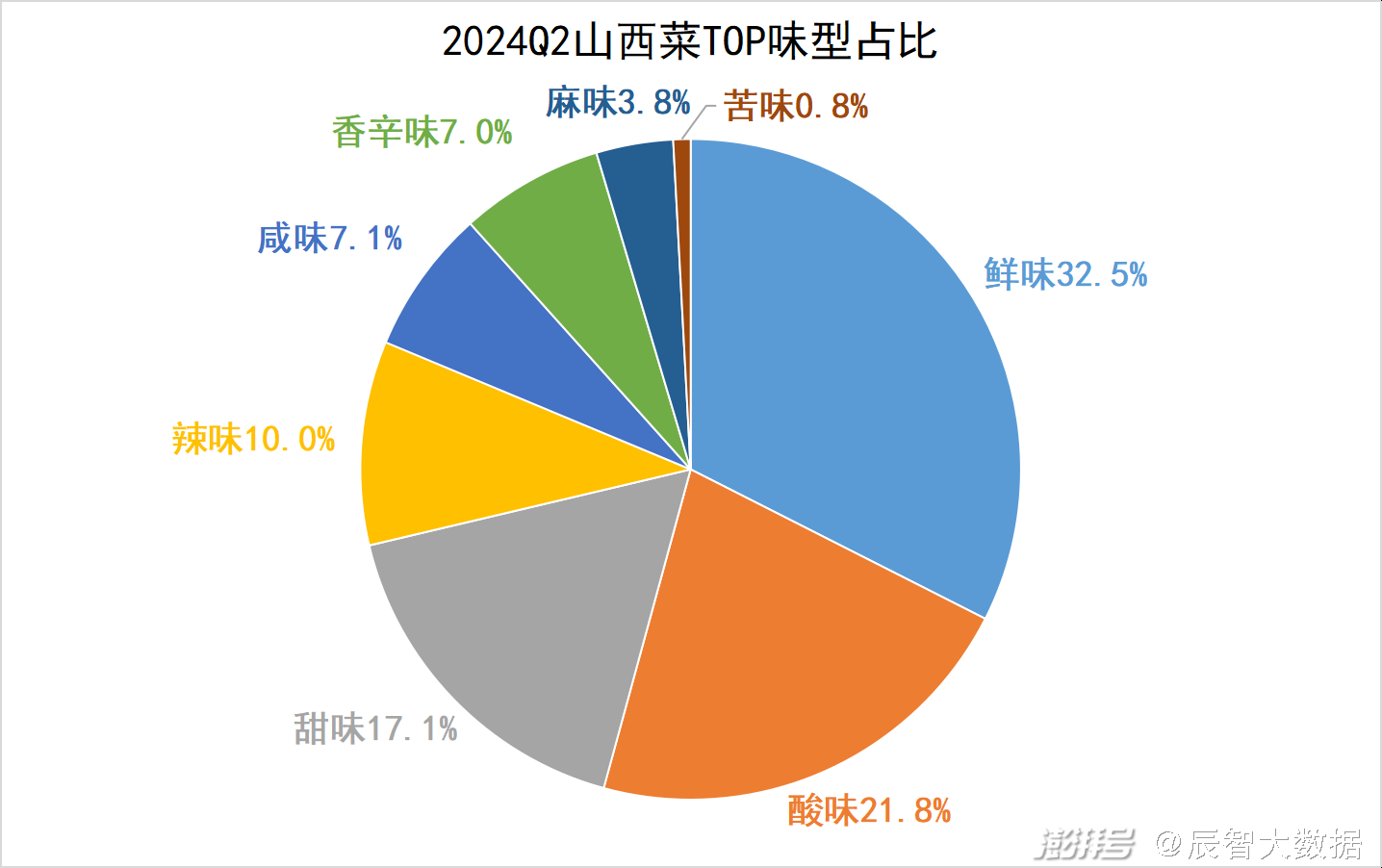 山西是华夏文明发祥地之一,山西老陈醋作为非遗物质文化遗产保护之一更具代表。醋早已深入山西人的餐桌,无论是吃面、还是做菜烹饪,都少不了放醋。辰智大数据显示,酸味是山西菜的第二大味型,酸味在山西菜中的占比高达21.8%,而在整体中式正餐菜品中,酸味占比11.1%,位列第四。