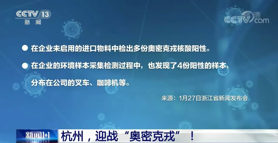 浙江省卫健委副主任 夏时畅:杭州本轮疫情发生之后,对工厂进口物料、原料进行了检查,这些原料都是没有使用,还在仓库里面的,一共检测出4份双基因阳性,检测结果是奥密克戎毒株。同时也对所有阳性感染者都做了全基因测序分析,通过比对发现,与浙江省现有输入的入境人员发现的奥密克戎毒株不一样,与国内其他城市流行的、或发现的奥密克戎毒株也不一样。我们查验了世界卫生组织公布的资料,发现与国外去年12月11日上报的毒株同源性非常高,专家研判完全一致。从物料检测情况来看,我们初步认为这起疫情跟境外进口物料存在密切联系。