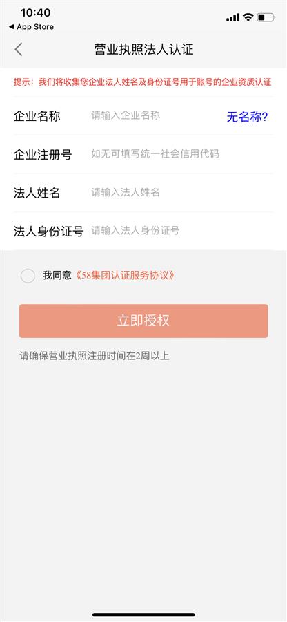 2月18日,极目新闻记者尝试在58同城上发布招聘信息,系统显示需要提供企业名称、注册号、法人姓名及身份证号等信息进行认证。