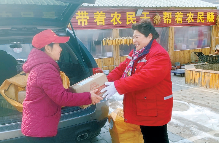 寇红艳(右)给村民送快件。本报记者 王海欣摄