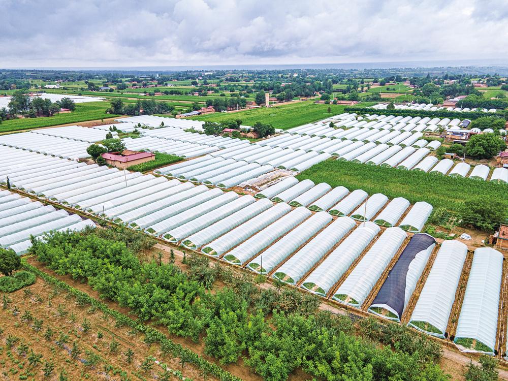 西峰区董志镇冯堡农民专业合作社种植基地建设温室大棚128座,种植西瓜60亩。秧苗错月栽培,西瓜从开始成熟上市到下架,可持续到立秋时节,亩产7000余斤。自上市以来,因口感沙甜,深受市场青睐,为村民带来了良好的经济效益。图为种植基地俯瞰。 (陇东报特约摄影 张应君)