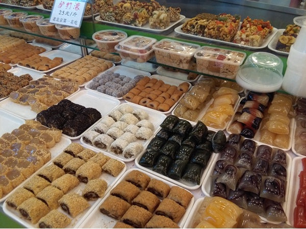 驴打滚是老北京传统小吃之一,成品黄、白、红三色分明,煞是好看。因其最后制作工序中撒上的黄豆面,犹如老北京郊外野驴撒欢打滚时扬起的阵阵黄土,因此而得名“驴打滚”。“驴打滚”的原料有大黄米面、黄豆面、白糖、香油等。它的制作分为制坯、和馅、成型三道工序。做好的“驴打滚”外层粘满豆面,呈金黄色,豆香馅甜,入口绵软,别具风味,是老少皆宜的传统风味小吃。