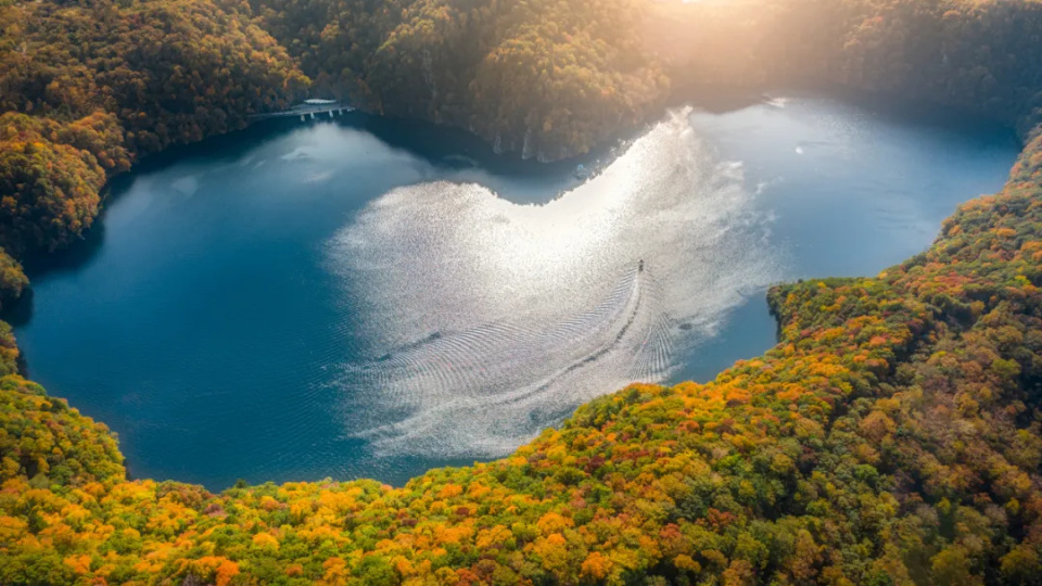 线路亮点: 秋意正浓,三角龙湾如同一块碧玉镶嵌在翠绿与金黄的交织中。四周松柏滴翠,榆叶泛黄,枫树染红,椴树披紫,一派秋色盎然。