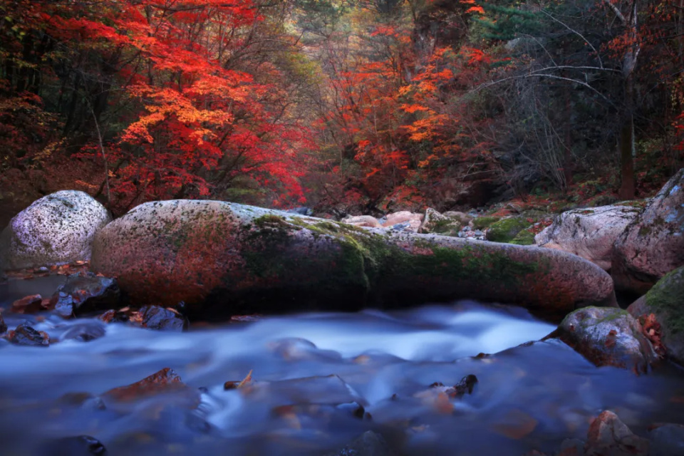 溪谷景区中,整条山谷被红叶装点,层林尽染,美不胜收。这一季的红叶奇观仅在9月下旬至10月上旬短暂绽放,美在瞬间,不可多得,不容错过的景点包括枫叶谷、放马坪、千年古树群等。