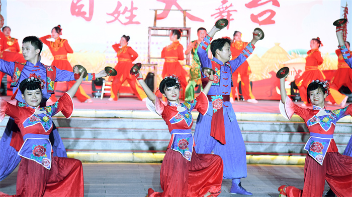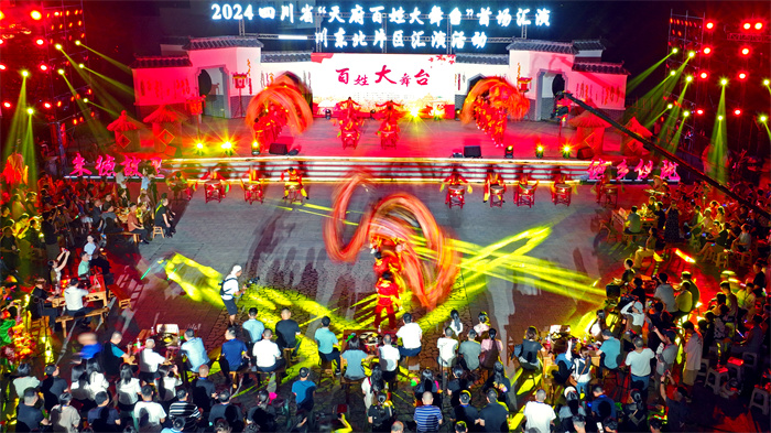 开场舞《金龙迎宾》先声夺人。作为省级非遗项目,仪陇金龙舞拥有200余年的历史,表演队员默契配合,一条条“金龙”腾空而起,气势磅礴,将群众对生活的美好期待尽情挥洒。本次参加展演的3条9节龙来自仪陇县复兴镇金舞龙队,鼓手来自马鞍镇,他们常年活跃在乡镇群众文化活动中。