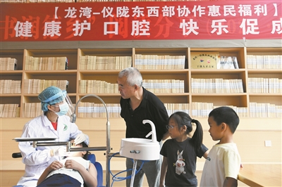 温州网讯 “小朋友,你有烂牙的情况,记得每天要以正确的方法刷牙哦。”8月29日下午,当记者到四川仪陇县的德园城市书房采访时,巧遇来自温州龙湾区第一人民医院口腔科的医生夏益枫,在城市书房的“公益讲座区”做“龙湾—仪陇东西部协作惠民福利”的义诊。夏益枫语气温柔地对20多位前来参加检查的6-10岁孩子嘱咐道。
