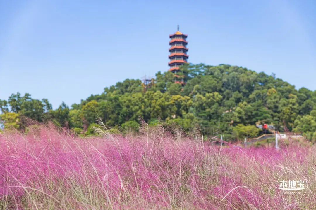 在红花山公园有一片人气超高的粉黛子花海,还有一座壮观宏伟的九层宝塔,是一个适合旅游打卡、散步休闲的公园
