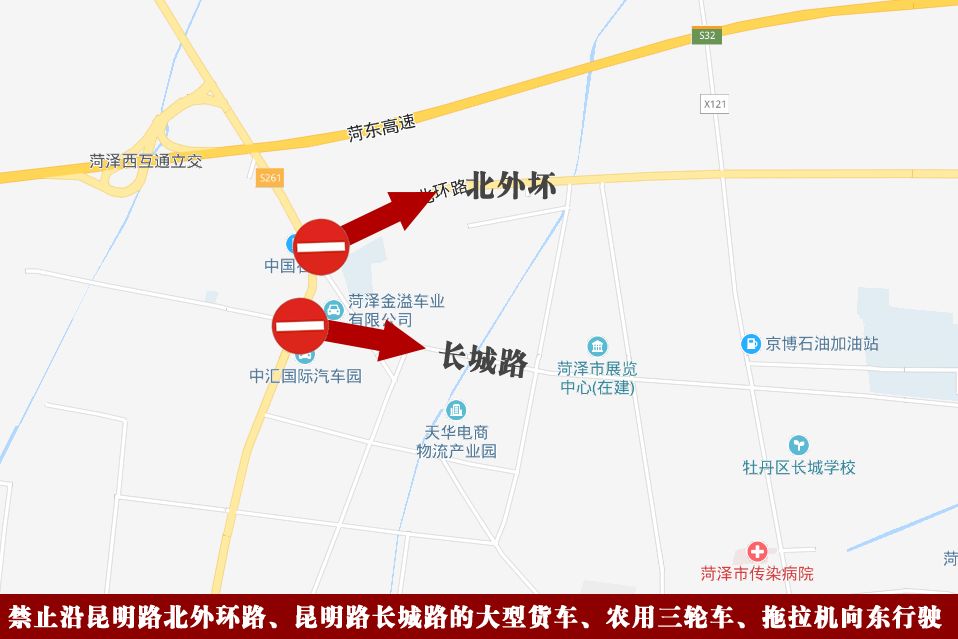 5、昆明路禁止沿昆明路北外环路、昆明路长城路的大型货车、农用三轮车、拖拉机向东行驶。