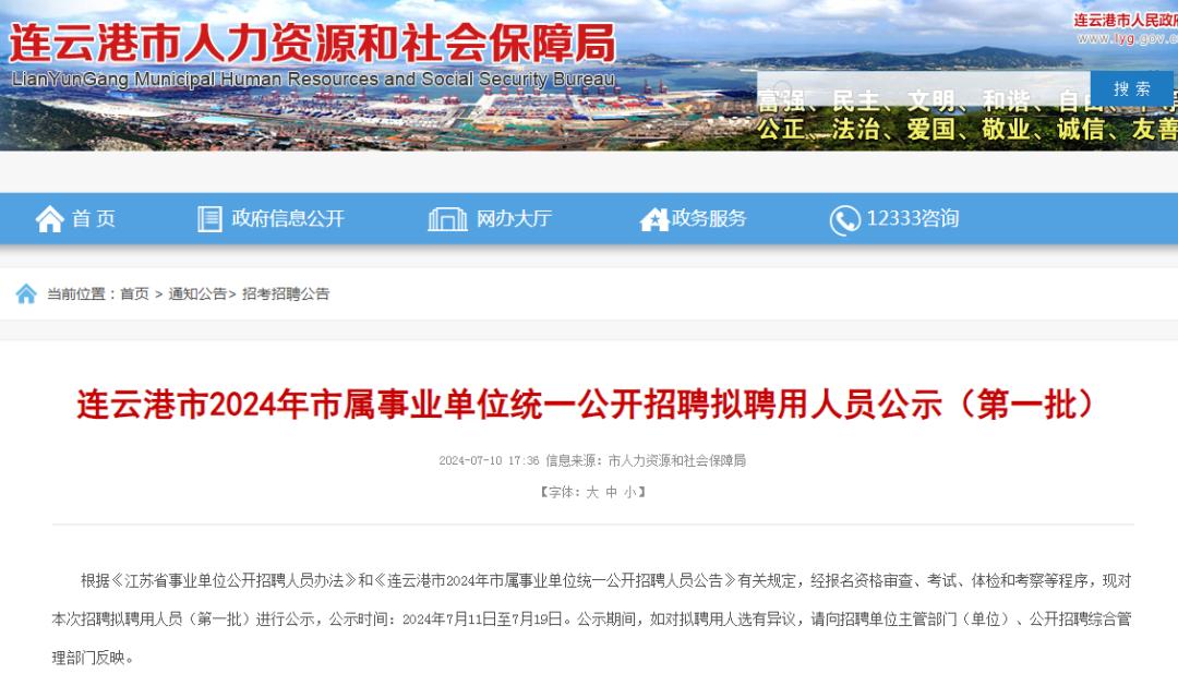 根据《江苏省事业单位公开招聘人员办法》和《连云港市2024年市属事业单位统一公开招聘人员公告》有关规定,经报名资格审查、考试、体检和考察等程序,现对本次招聘拟聘用人员(第一批)进行公示,公示时间:2024年7月11日至7月19日。公示期间,如对拟聘用人选有异议,请向招聘单位主管部门(单位)、公开招聘综合管理部门反映。