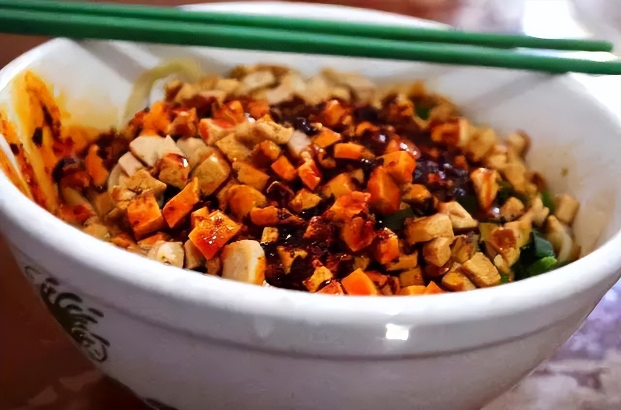 江洛镇的棒棒面中最主要的配料就是豆腐丁,豆腐用传统手法制成,外皮微黄,细而硬,炒出的豆腐丁香酥味美,而且不易碎,鲜红的油拨辣子、翠绿的葱花、干香微黄的豆腐丁,再配上做法独特的棒棒面条,干拌调好,让佐料裹着每一根面条,每一口都味道十足。