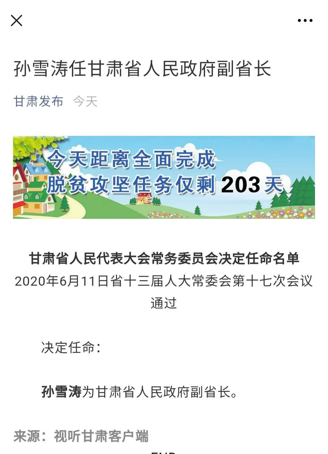 据甘肃发布,2020年6月11日甘肃省十三届人大常委会第十七次会议通过甘肃省人民代表大会常务委员会决定任命名单。决定任命:孙雪涛为甘肃省人民政府副省长。