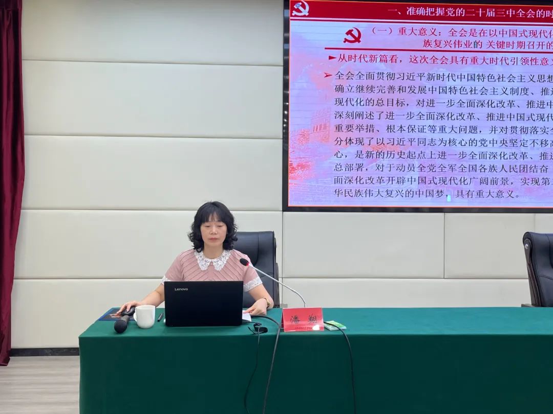 会上,南充市妇联党组成员、副主席潘翔全面深入地解读了党的二十届三中全会召开的背景、主要内容和精神实质,就全会中涉及到妇女儿童、家庭的内容进行重点解读,号召各级妇联组织要充分认识学习贯彻全会精神的重大意义,切实把思想和行动统一到全会的决策部署上来,以全会精神为指引,更加积极主动地参与到妇女儿童权益保护、家庭文明建设等工作中,努力为妇女群众办实事、解难题。