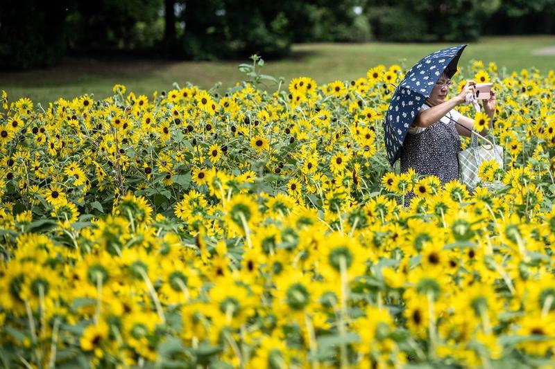 8月2日,一名撑伞游客在日本东京一处向日葵田中拍照。