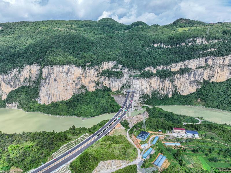 这是8月2日拍摄的渝湘复线高速彭酉路标段阿蓬江大桥建设现场(无人机照片)。