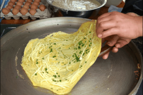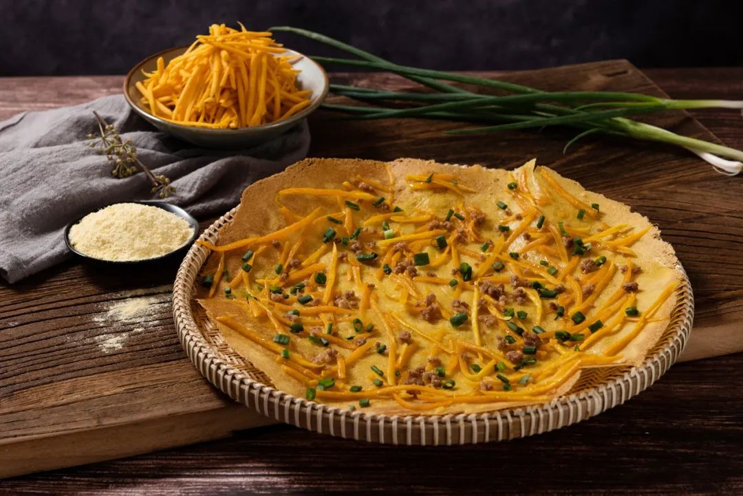 起锅后形如圆锅,色泽金黄、口感松脆,可根据需要用刀切成小片食用,糊拉汰薄如纸,松软香脆,咬一口香味四溢,油脂香、淀粉香、蛋黄香、葱香四散开来,引人食欲大开。