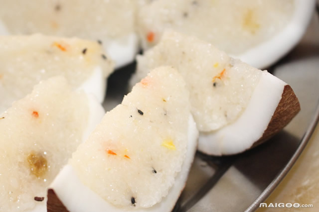 椰子饭,又称椰子船,原是海南琼海、文昌一带的传统小吃,是海南传统农家特色美食小吃之一,也是来到三亚一定要吃的特色小吃之一,由优质糯米、天然椰肉和椰汁一起蒸熟而成。椰子饭其特点是形、香、味、色俱佳,具有浓厚、质朴的椰乡气息,椰肉和米饭,脆糕结合,慢品细嚼,椰香浓郁,清甜爽口,软软糯糯。椰子饭既可以当作主食吃,又可搭配上三亚的海鲜一起来吃,绝对会让你感受到不一样的海岛风味。品尝三亚椰子饭,既可享用甘甜的椰肉,也可以吃到有着椰子香味的糯米饭。 【 详细>>】