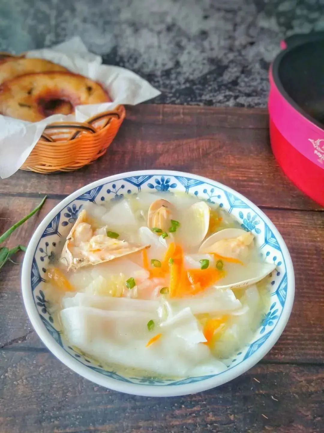 而锅里的汤汁也颇有些讲究,以蚬子汁为底,再配些熟鱼干,小肠,花蛤,香菇等佐料,热气腾腾间,满满都是山与海的鲜美!
