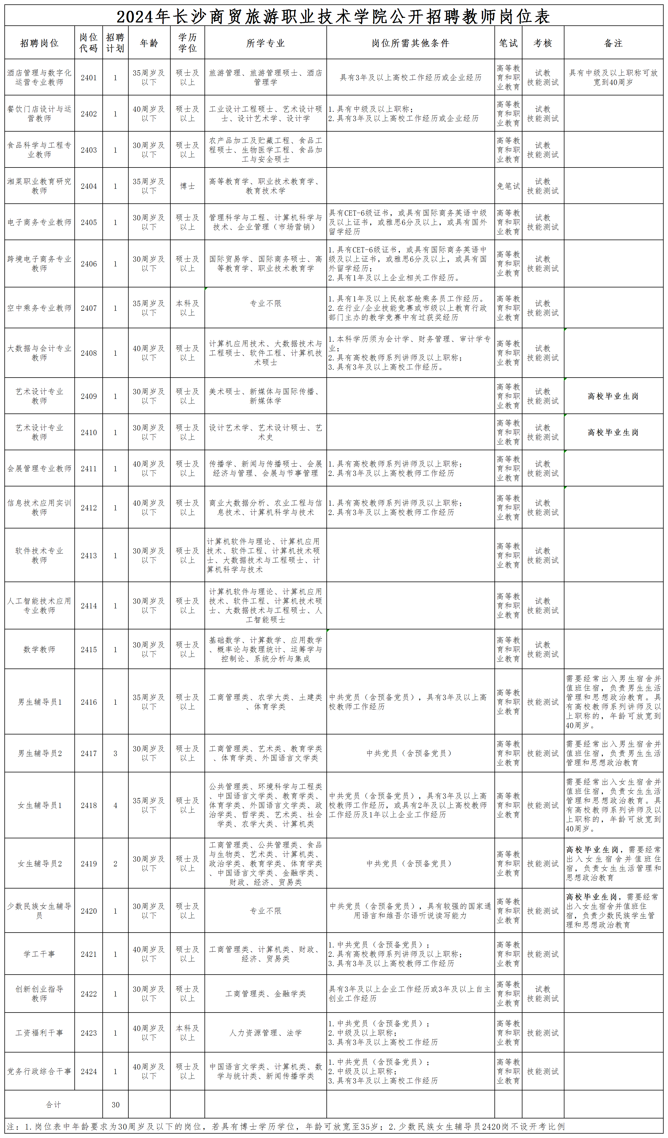 此次招聘岗位24个,招聘计划30名,详见附件1:《2024年长沙商贸旅游职业技术学院公开招聘教师岗位表》。