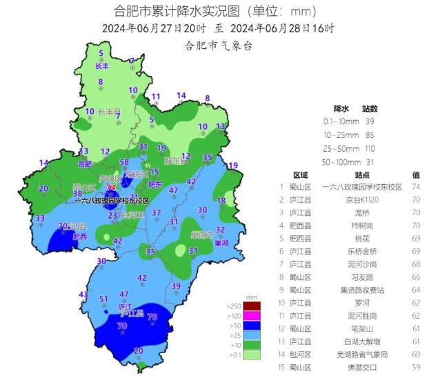 1.实况:从昨天夜里降雨开始至今日16时累计降雨量(毫米):全市平均26,最大一六八玫瑰园学校东校区 74;市区平均26,最大一六八玫瑰园学校东校区 74;庐江县平均41,最大京台K1120 70;肥西县平均29,最大柿树岗 70;肥东县平均17,最大桥头集桥集 47;巢湖市平均28,最大庙岗清涧 46;长丰县平均7,最大双凤 16。最大小时雨强一六八玫瑰园学校东校区60毫米(15-16时)。