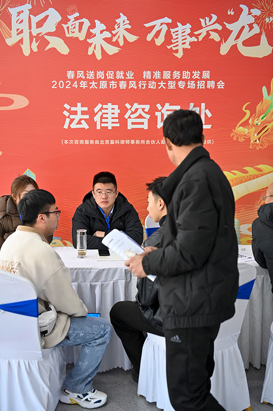 3月2日,2024年太原市春风行动大型专场招聘会设立的法律咨询处的工作人员和求职者交流。