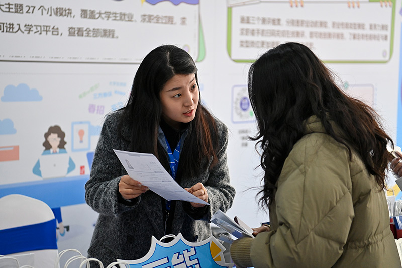 3月2日,一家互联网企业工作人员在2024年太原市春风行动大型专场招聘会上与求职者交流。