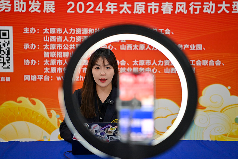 3月2日,工作人员在2024年太原市春风行动大型专场招聘会上直播。