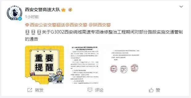 1、途经施工区域车辆经西安绕城高速由北向南方向单幅双向行驶或提前择路绕行,其他路段正常通行。禁止货车和大型客车驶入西安绕城高速单幅双向通行路段。